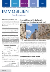 2016 2018 2020 2022 Sommer 2022 Immobilienförderung wieder gestartet Die Bundesregierung will den Ausbau erneuerbarer Energien schrittweise beschleunigen und dafür sorgen, dass Deutschland klimaneutral wird. Rund ein Drittel aller Treibhausgasemissionen werden von Wohn- und Geschäftshäusern verursacht. In diesem Sektor besteht also viel Einsparpotenzial – sowohl bei Neubauten als auch im Bestand. Daher stellt die Bundesregierung die Immobilienförderung auf neue Füße. Energiesparmaßnahmen helfen zudem dabei, dass Deutschland sich von einseitigen Abhängigkeiten befreit. Seit Ende April können wieder Anträge bei der KfW für die Neubauförderung gestellt werden. Die Förderbedingungen wurdenmodifiziert. Als finaler Schritt der Neuausrichtung der Neubauförderung ist ab Januar 2023 ein neues umfassendes Programm mit dem Titel „Klimafreundliches Bauen“ vorgesehen. Energiepreise, Materialkosten, Inflationsrate und Zinsen beeinflussen sich gegenseitig. Führende Finanzfachleute erwarten steigende Darlehenszinsen. Immobilienmarkt: Leitet die Zinswende eine Preiswende ein? Baupreise steigen Die Preise für den Neubau von Wohngebäuden in Deutschland sind im Februar 2022 um 14,3 Prozent gegenüber dem Vorjahr gestiegen. Den stärksten Anstieg verzeichneten Zimmer- und Holzbauarbeiten. Sie sind aufgrund der erhöhten Nachfrage nach Bauholz um 33,9 Prozent teurer geworden. Schon in vergangenen Zeiten zeigte sich, dass akute Krisen den Stellenwert von Sachwerten – zu denen auch Immobilien gehören – erhöhen. Das wird auch jetzt wieder deutlich. Nach zwei Quartalen moderater Preissteigerungen zogen die Preise für Immobilien im ersten Quartal 2022 bundesweit deutlich an. Die Preise gebrauchter Einfamilienhäuser legten mit 5,4 Prozent besonders stark zu. Eigentumswohnungen im Bestand verteuerten sich um drei Prozent. In unsicheren Zeiten legen Banken für alle Investments strengere Maßstäbe an. Schon jetzt haben sich Immobilienkredite deutlich verteuert. Die Entscheidungen der Europäischen Zentralbank, EZB, wirken sich direkt auf die Immobilienfinanzierung aus. Derzeit strafft die EZB ihre Geldpolitik, lässt sich aber noch Zeit und setzt offenbar auf Flexibilität. Finanzfachleute gehen davon aus, dass im Verlauf des Jahres mit einer Erhöhung des Leitzinses zu rechnen ist. Bis dahin haben alle Beteiligten Zeit, sich auf neue Marktbedingungen und eine andere Entwicklung der Immobilienpreise einzustellen. Foto: Lena Lensen, Pixabay Inflation ungewöhnlich hoch Die Inflationsrate in Deutschland lag imMärz 2022 bei 7,3 Prozent. Damit erreichte sie einen neuen Höchststand seit der Wiedervereinigung. Als Ursache gelten Lieferengpässe und deutliche Preisanstiege bei allen Energieprodukten infolge der aktuellen Krisensituationen. Immobilienfinanzierung teurer Die Zinsen stiegen im März um 0,5 Prozent und verteuern Immobilienkredite spürbar. Bei der Erhöhung handelt es sich zwar vorerst um Nachkommastellen, aber über die Dauer einer Immobilienfinanzierung gerechnet macht sich die Verteuerung deutlich bemerkbar. Wer ein Haus oder eine Wohnung finanzieren will, muss mit schwankenden Kursen rechnen. Für Anschluss- oder Umfinanzierungen ist jetzt der richtige Zeitpunkt. Entwicklung der Hypothekenzinsen Baupreisindex für Wohngebäude Verbraucherpreisindex 2015=100, Quelle: Destatis 2022 Veränderung gegenüber dem Vorjahresmonat in Prozent 2015=100, Quelle: Destatis 2022 10 5 0 April 2020 Januar 2018 Januar 2020 Januar 2022 April 2021 April 2022 2,2 2,0 1,8 1,6 1,4 1,2 1,0 0,8 0,6 0,4 160 140 120 100 80 20 Jahre Zinsbindung 10 Jahre Zinsbindung Energie VPI insgesamt Quelle: Finanzpartner.de EMPFEHLUNGEN HINWEISE NEWS TIPPS INFOS Markt | Wirtschaft | Recht | Bauen | Finanzieren | Versichern | Vermieten | Verkaufen | Verwalten | Zahlen | Preise KundenZeitung