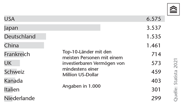 Laut einer Studie betrug das Privatvermögen in Deutschland im Jahr 2020 rund 16,4 Billionen Euro. Auf Platz zwei folgen Frankreich mit 12,6 Billionen Euro sowie Großbritannien und Italien mit je zehn Billionen Euro. In diesen Ländern sind die Privatvermögen trotz rückläufiger Wirtschaftsleistung gewachsen. Zu den einkommensreichsten zehn Prozent gehören in Deutschland Singles ab einem monatlichen Nettoeinkommen von rund 3.700 Euro.