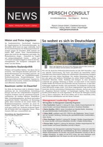 Ausgabe: Herbst 2019 Management Leadership Programm Wir begrüßen im Management Leadership Programm: ◗ Sina Staufenbiel, HypZert S, Leitung NL Essen, direkte Ansprechpartnerin für unsere Kunden und (neue) Mitarbeiter (m|w|d) in Nordrhein-Westfalen ◗ Marios Batsillas, MRICS, Senior Consultant am Standort Berlin, Vertretung der geschäftsführenden Gesellschafterin Frau Strauß ◗ Tobias Wolff, zertifiziert nach ISO 17024 für alle Objektarten, Senior Consul- tant am Standort Hamburg, Vertretung des geschäftsführenden Gesellschafters, Herrn Fischer ◗ Peter Herrlinger, HypZert F, Leitung NL Stuttgart, Direkter Ansprechpartner für unsere Kunden und (neue) Mitarbeiter (m|w|d) in Baden-Württemberg ◗ Thomas Rohr, HypZert F, Leitung NL München, Direkter Ansprechpartner für unsere Kunden und (neue) Mitarbeiter (m|w|d) in Bayern Die Teilnehmer des Management Leadership Programms werden auf weiterfüh- rende Aufgaben innerhalb der Geschäftsleitung der PCCS vorbereitet und sind direkte Ansprechpartner für Kunden und (neue) Mitarbeiter (m|w|d) an den je- weiligen Standorten. So stellen wir bei PCCS sicher, das unser Wachstum auch qualitativ abgebildet wird. Wir freuen uns sehr auf die Zusammenarbeit! Mieter oder Eigentümer, die etwas an ihrer Wohnung verbessert haben, denken mit Stolz an ihr Zuhause und sind meistens auch glücklich damit. Wie sich die deutschen Wohnimmobilienmärkte im Jahr 2019 darstellen, zeigt eine aktuelle Untersuchung. Die Preise und Mieten für Immobilien stehen weiterhin unter dem starken Einfluss der anhaltenden Urbanisierung, knappen Baulands und einer hohen Nachfrage. Der stärkste Mietanstieg erfolgte in den sehr guten und mittleren Wohnlagen der sieben Städte Frankfurt, Köln, Düsseldorf, München, Berlin, Hamburg und Stuttgart. In einer deutschen Großstadt eine günstige Wohnung zu finden, ist nicht leicht. In den meisten Städten klaffen die Wünsche der Suchenden und das Preisniveau, zu demMiet- wohnungen angeboten werden, weit auseinander. Die Kaufpreise in den deut- schen Metropolen steigen weiter. Trotz dieser angespannten Lage sind fast alle Deutschen mit ihrer persönlichen Wohnsituation zufrieden, das hat eine Studie des „Happiness Research Institute“ in Kopenhagen ergeben. Diese Aussage betrifft sowohl Mieter als auch Eigentümer. 90 Prozent der Befragten können sich zu Hause entspannen, 88 Prozent fühlen sich in ihrer Immobilie sicher, und 70 Prozent identifizieren sich mit ihrem Zuhause. So wohnt es sich in Deutschland Mieten und Preise stagnieren Im bundesdeutschen Durchschnitt stagnieren die Angebotsmieten für Bestandswohnungen. Im November 2018 waren sie sogar rückläufig. Auch die Durchschnittspreise für Neubaueigentumswoh- nungen gingen im Dezember 2018 erstmals seit Januar 2007 zurück. Diese Durchschnittswerte gelten aber nicht für alle Regionen und Städte. Die Bestandsmieten stiegen – vermutlich im Vorgriff auf mietpreisdämpfende Gesetze – zuletzt um 1,4 Prozent und damit doppelt so stark wie die Neu- vertragsmieten. Die Kaufpreise entkoppeln sich weiter von den Mieten. Veränderte Baulandpolitik Wohnen soll bezahlbar bleiben. Um dieses Ziel zu erreichen, wird dringend Bauland gebraucht. Die Baulandkommission hat Vorschläge gemacht, um Prozesse und Abläufe bei Grundstücksvergabe, Baulandausweisung, Baugenehmigungs- sowie Planungsverfahren zu beschleunigen. Experten for- dern keine neuen Gesetze, sondern eine intelligente und effizientere Baulandpolitik. Bauzinsen weiter im Dauertief Die Höhe der Bauzinsen steht in direktem Zusam- menhang mit der wirtschaftlichen Entwicklung Europas und mit den weltpolitischen Ereignissen. Ungelöste Probleme sind die anhaltende Konjunk- turschwäche, die niedrige Inflation, Handelskon- flikte, Verschuldungsquoten, der Brexit und andere geopolitische Risiken. Immobilien als Wertanlage gelten daher weiterhin als der sichere Hafen. Die Baufinanzierungszinsen erreichen ein neues Re- kordtief. Anfang des Jahres sahen die Prognosen noch ganz anders aus. Analysten rechneten eigent- lich ab Herbst 2019 mit steigenden Zinsen. Dieses Szenario fällt nun voraussichtlich aus. Foto: Michael Gaida | Pixabay Entwicklung der Hypothekenzinsen Laufzeit 10/20 Jahre (hellgrau) Laufzeit Quelle: finanzpartner.de 4,5 4,0 3,5 3,0 2,5 2,0 1,5 1,0 2012 2016 2010 2014 2018 2019 NEWS Markt | Wirtschaft | Recht | Zahlen Persch Consult GmbH | Chartered Surveyors Hamburg | Leipzig | Berlin | Essen | Kopenhagen www.perschconsult.de